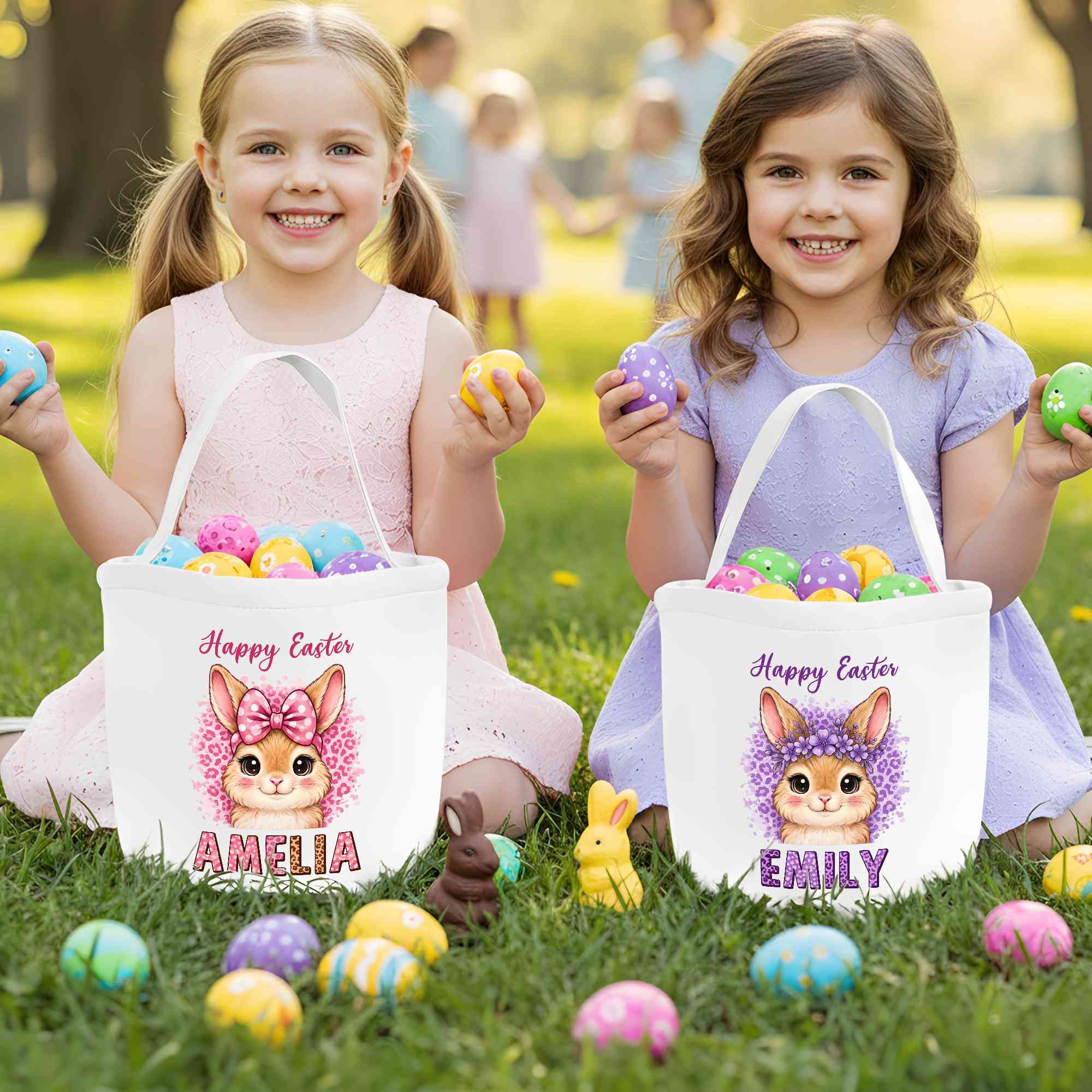 • Personalized Name Leopard Cartoon Bunny Easter Basket, Easter Egg Hunt Bucket Bag, Large Capacity Canvas Goodie Bag, Easter Gift for Kids/Boys/Girls